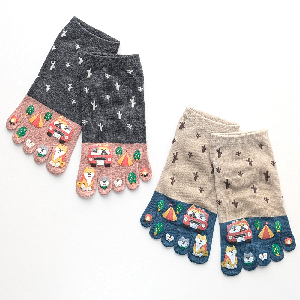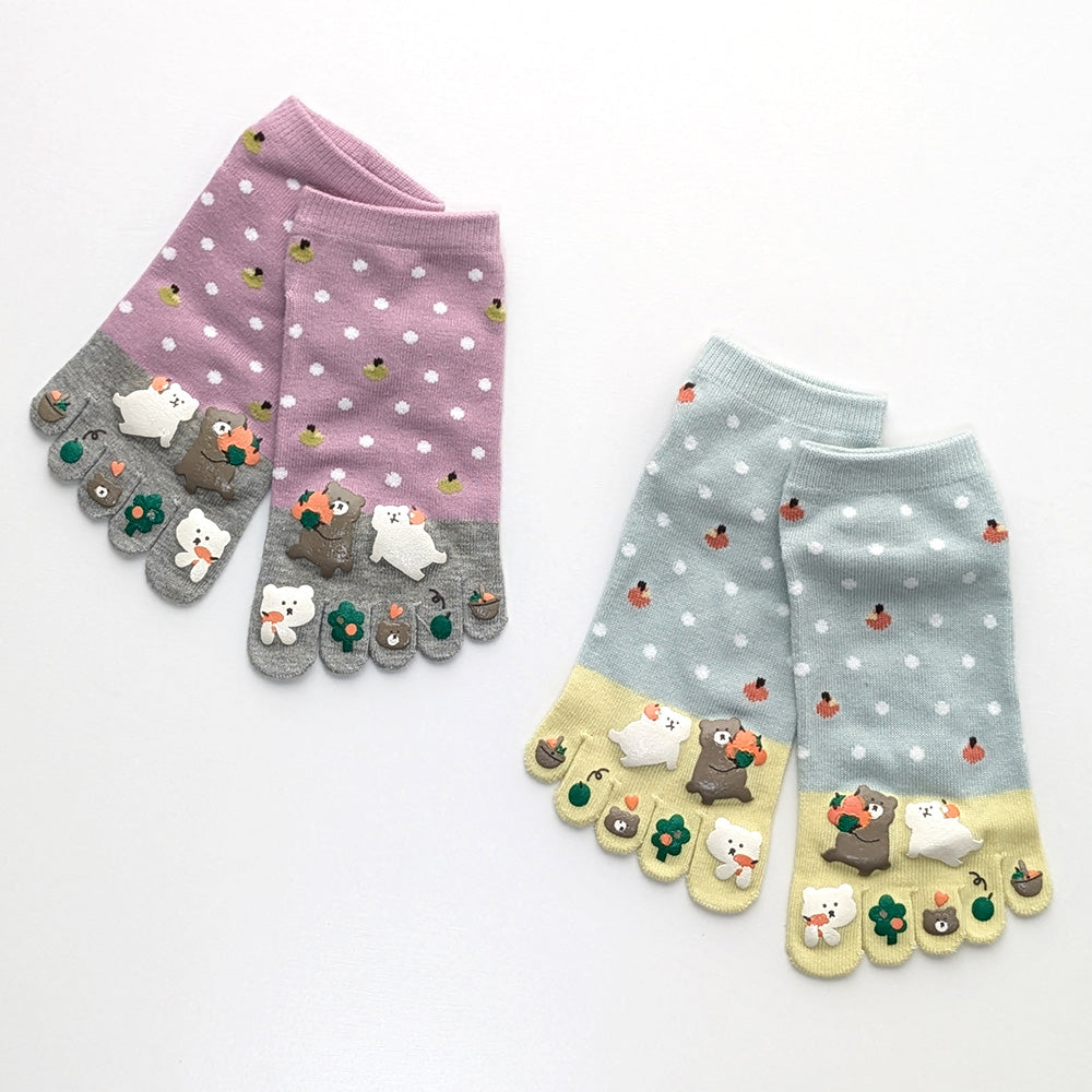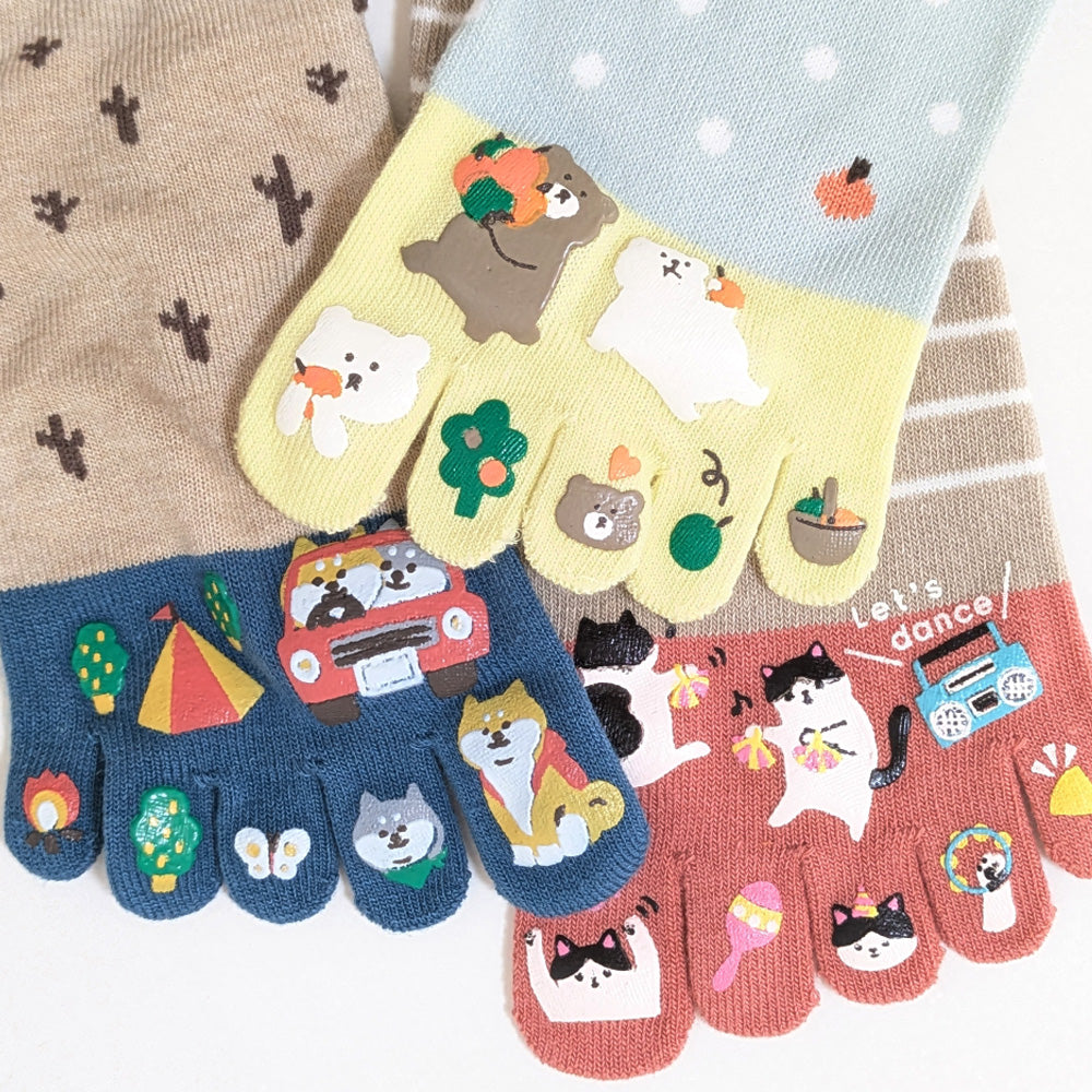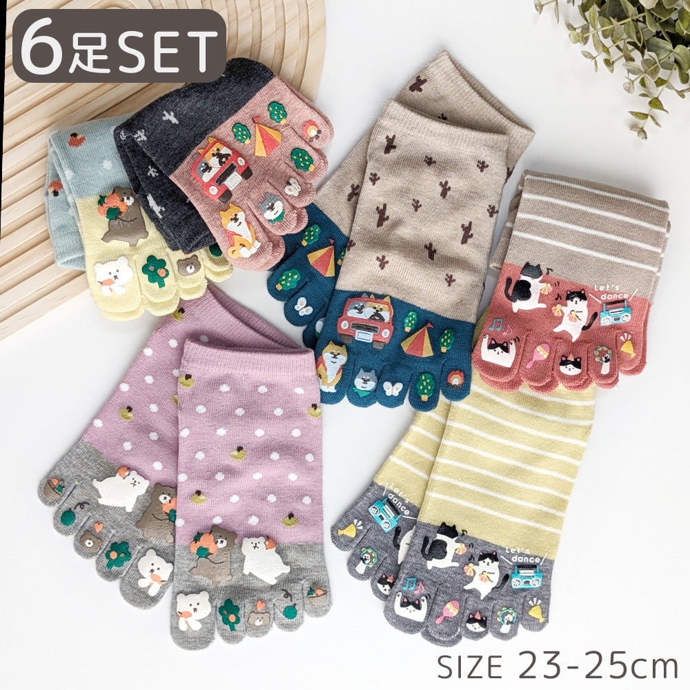 5本指ソックス 6足セット 可愛いプリントデザイン くるぶし丈 / 靴下 レディース 五本指 ショート丈 ソックス 5本指靴下 23-25cm ネコ 猫 犬 イヌ クマ